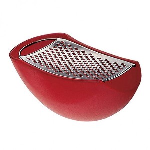 Rallador con recipiente en resina termoplástica, roja y acero brillante.
